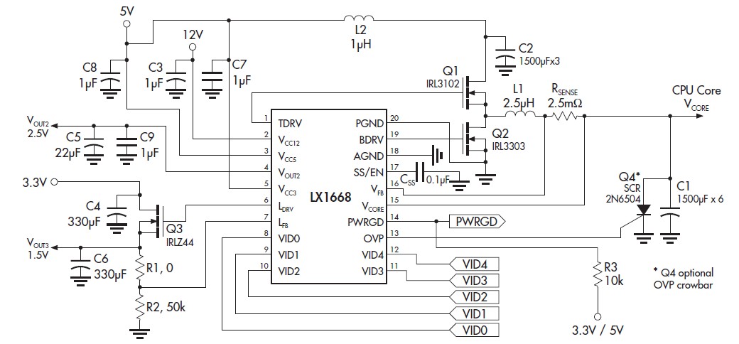 LX1668CPW features: (1)5-Bit Programmable Output For CPU Core Supply; (2)Internal Fixed 2.5V Low Dropout Regulator; (3)Adjustable Linear Regulator Driver; (4)Complete Single-Chip Power; (5)Solution For Pentium II Processors; (6)No Sense Resistor Required For Short-Circuit Current Limiting; (7)Soft-Start And Hiccup-Mode Current Limiting Functions; (8)Modulated Constant Off-Time Control Mechanism For Fast Transient Response And Simple System Design; (9)Power Good Flag; (10)Over-Voltage Pin & SCR; (11)Digital-Compatible Inputs (Including VID Pins); (12)Output Disable Function Shuts Off PWM While Keeping 2.5V LDO Active - Compatible With "Green PC" And "Instant On" Requirements; (13)Compatible to VRM8.2 - 8.4 Specifications.