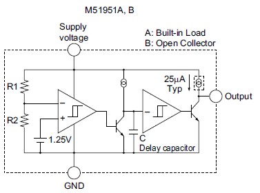 The M51951AML is a kind of Voltage Detecting, System Resetting IC, semiconductor integrated circuit designed for detecting supply voltage and resetting all types of logic circuits such as CPUs. The M51951AML includes a built-in delay circuit to provide a retardation time (200 μs Typ). It fined extensive applications, including battery checking circuit, level detecting circuit and waveform shaping circuit. The typical applications of M51951AML include: Reset circuit of Pch, Nch, CMOS, microcomputer, CPU and MCU, Reset of logic circuit, Battery check circuit, switching circuit back-up voltage, level detecting circuit, waveform shaping circuit, delay waveform generating circuit, DC/DC converter, over voltage protection circuit.